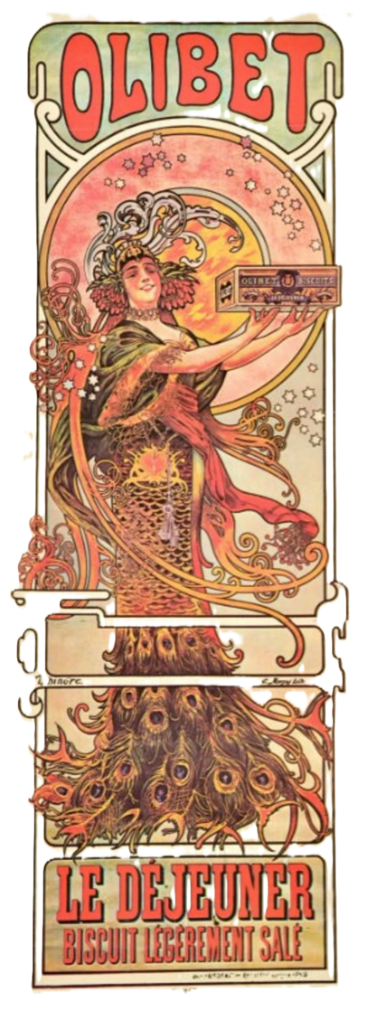 Hingre designed this poster in 1898 for OLIBET, a French Biscuit Company that advertised 'Le Dejeuner Biscuit Legerement Sale' (The Lightly Salted Lunch Biscuit), featuring a woman in an elaborate Peacock Feather mofit dress. STUNNING!